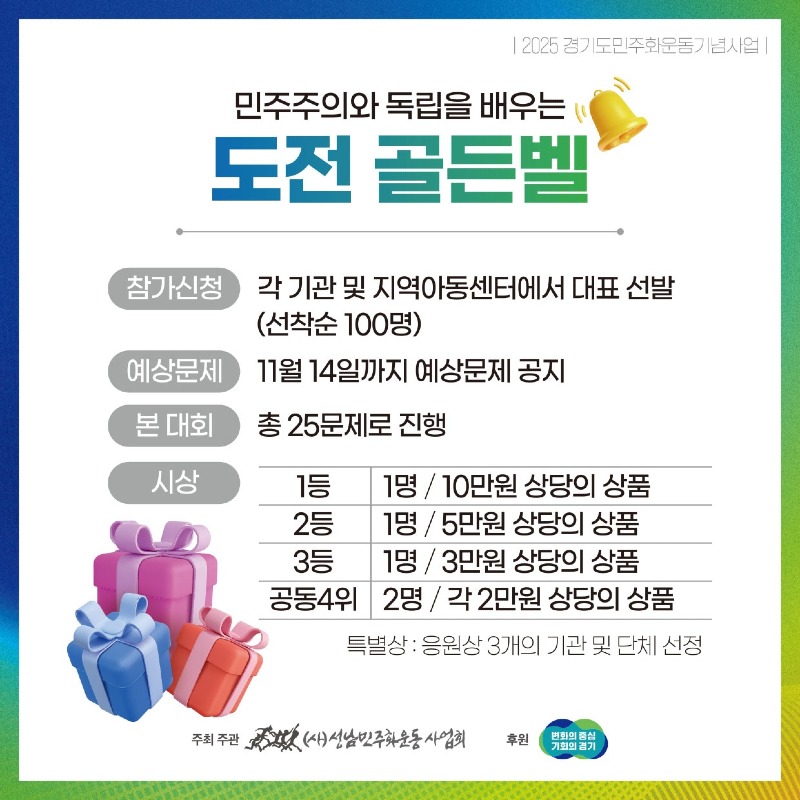 사단법인 성남민주화운동사업회(이사장 이상락)는 오는 29일 11시 성남 탄천종합운동장 체육회관 1층 이벤트홀에서 ‘2025 민주시민교육 축제 한마당’을 개최한다고 밝혔다.