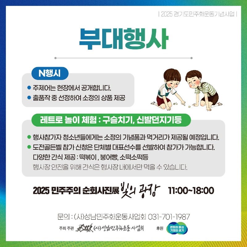 부대 행사로는 민주주의 이미지 그리기, N행시 짓기를 비롯해 구슬치기, 신발 던지기 등 온 가족이 즐길 수 있는 '레트로 놀이 체험'이 진행된다. 행사장 한편에서는 ‘2025 민주주의 순회사진전 - 빛의 광장’이 열려 민주주의의 역사를 시각적으로 조망할 수 있다.