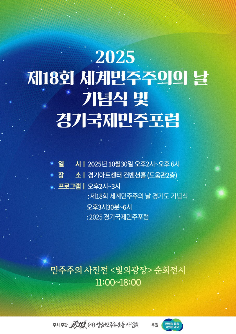 제18회 세계민주주의의 날을 기념하는 ‘2025 경기 국제민주포럼’이 10월 30일 오후 2시, 경기아트센터 컨벤션홀에서 성황리에 열렸다.